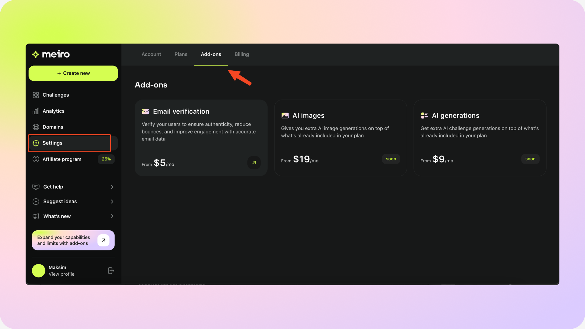 Go to Settings and click on the Add-ons tab. Select the Email verification add-on