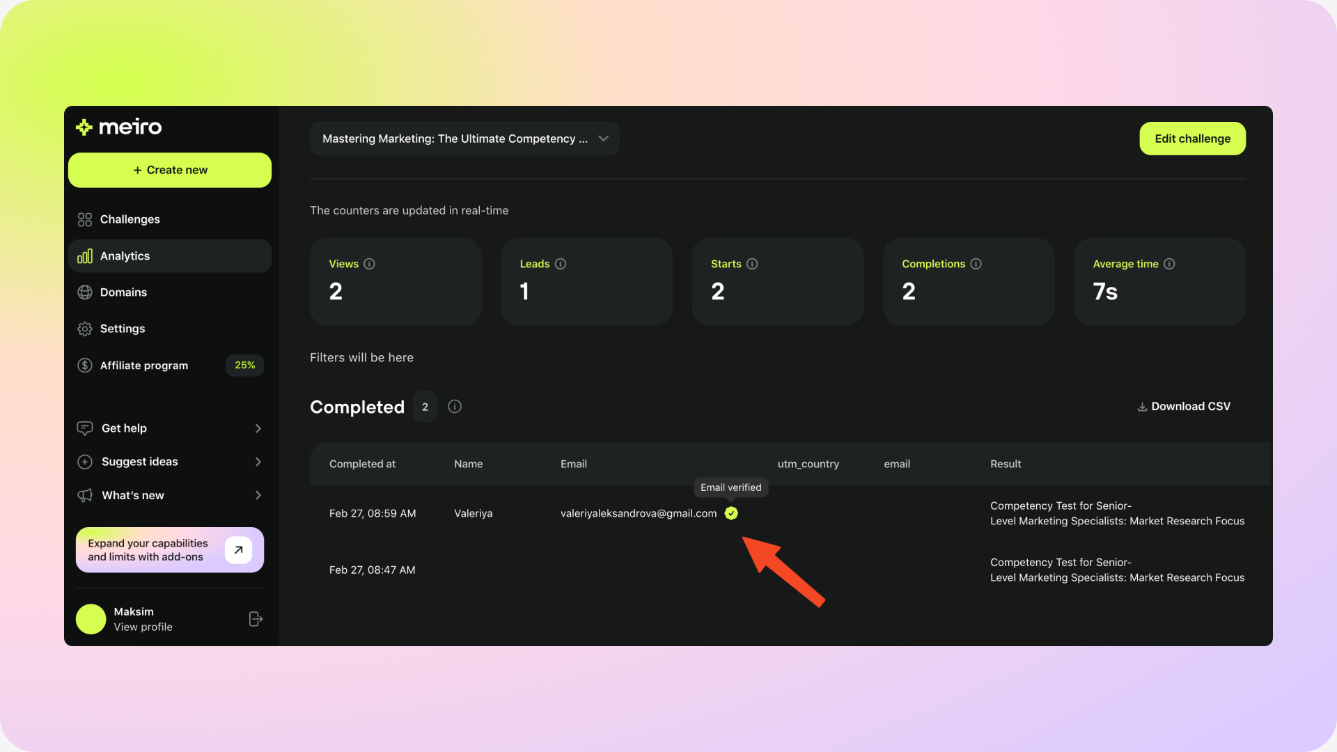 In the Analytics tab, verified emails will be displayed. You can also export the challenge data and filter by “Verified email = TRUE” for future targeting.